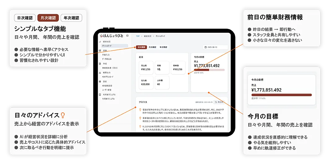 売上・客数・仕入など、経営の基本指標を一画面で確認できます。