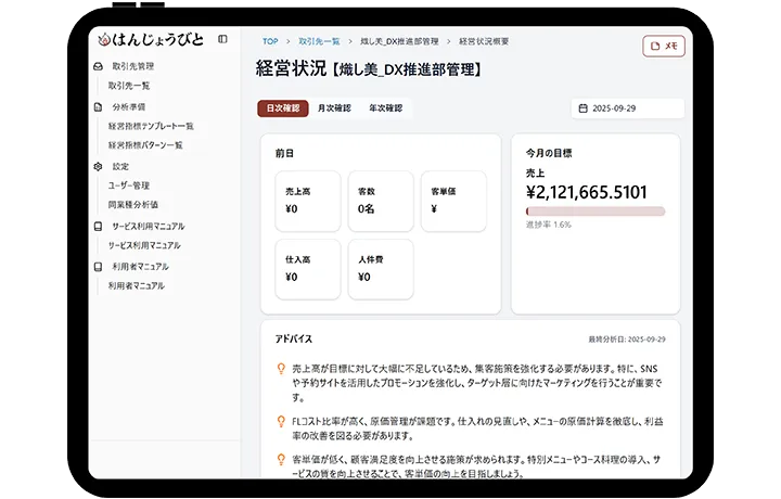 日々の売上や目標達成率を一目で確認。経営状況をわかりやすく可視化し、次の一手を考える手助けになります。